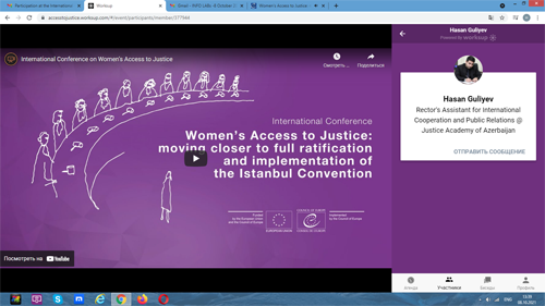 Avropa Şurası Ədliyyə Akademiyası ilə birgə hakimlər, prokurorlar və ədliyyə işçiləri üçün 7-8 oktyabr tarixində “Qadınların ədalət mühakiməsinə çıxışı: İstanbul Konvensiyasının tam ratifikasiyasına və tətbiqinə yaxınlaşmaq, Yaxşı İdarəçilik üçün Tərəfdaşlıq” mövzusunda onlayn formada II Beynəlxalq Konfrans keçirmişdir. Konfrans Bütün Şərq Tərəfdaşlığı ölkələri də daxil olmaqla Avropa Şurasına üzv olan ölkələrdən səlahiyyətli nümayəndələr, Avropa Şurasının müvafiq hökumətlərarası komitələrinin nümayəndələri, Gender Bərabərliyi Komissiyasının üzvləri, beynəlxalq təşkilatların səlahiyyətli nümayəndələri, vətəndaş cəmiyyəti mütəxəssisləri, elmi dairələr, media nümayəndələri və digər maraqlı tərəflərin iştirakı ilə baş tutmuşdur. Silsilə olaraq keçirilən tədbirlərin davamı və mövcud layihə çərçivəsində həyata keçirilən bütün fəaliyyətlərin əsas məqsədi kimi bu tədbirdə də Şərq Tərəfdaşlığı ölkələrində ədalət sistemlərinin gender-həssaslığını artırmaq və şiddətə məruz qalan qadınların ədalətə çıxışını gücləndirmək və İstanbul Konvensiyasının təsdiqi və tətbiqinə dair məlumatlılığı və dəstəyi artırmaq nəzərdə tutulmuşdur.Altı Şərq Tərəfdaşlığı ölkələrindən biri olaraq ölkəmizdən 10 nəfər hakim, 3 nəfər prokuror və Ədliyyə Nazirliyinin Ədliyyə Akademiyasının 5 əməkdaşı iştirak etmişdir.Konfransın birinci mərhələsi canlı yayım formasında həyata keçirilmişdir. Açılış nitqi Avropa Şurasının Baş Katibi Marija Pejčinović Burić tərəfindən “Avropa İnsan Haqları Konvensiyası və İstanbul Konvensiya zorakılıq qurbanı olan qadınlara ədalətin təmin edilməsi vasitəsi kimi” mövzusunda olmuşdur. Həmçinin “Qadına qarşı şiddət:kölgə pandemiyası, təsiri və qadınların ədalətə çıxışındakı maneələr”ə dair Christine Chinkin, Böyük Britaniya London İqtisadiyyat Məktəbinin fəxri professoru tərəfindən əsas təqdimat həyata keçirilmişdir.Konfransın ikinci günündə Zoom platformasında LAB-lar adı altında hər bir ölkənin nümayəndələrindən ibarət qruplar yaradılmış və həmin qruplarda gender bərabərliyini inkişaf etdirmək və şiddət qurbanı olan qadınların hüquqi müdafiəsini təmin etmək üçün atılan addımlar müzakirə olunmuşdur. Əlavə olaraq LAB-larda qadınlara qarşı şiddət və məişət zorakılığı qurbanlarının ədalətə qovuşmaq üçün qarşılaşdıqları maneələri və stereotipləri aradan qaldırmaq üçün hüquq mütəxəssislərinin nələri edə biləcəkləri, qadın zorakılığı və məişət zorakılığı qurbanlarının ədalətlə təmin olunması üçün hansı hüquqi dəyişikliklərin lazım olması, qadınların ədalətə çatımlılığına dair sistemlərinin keyfiyyətli olmasını təmin etmək üçün hüquqşünaslar və bu sahəyə dair qərar qəbul edə biləcək orqanların hansı beynəlxalq standartları və təsirli vasitələri tətbiq etməsini ehtiva edən məsələlər ətraflı müzakirə olunmuşdur. LAB-lar iki dildə- ingilis və rus dilində aparılmışdır. Rus dilində aparılan LAB-lardan birinin moderatoru Ədliyyə Akademiyasının əməkdaşı Həsən Quliyev olmuşdur.Daha sonra isə Avropa Birliyi Fundamental Hüquqlar Agentliyindən Albin Dearing, Venesiya Komissiyasından Veronika Bilkova, BMT Qadınlar üzrə Avropa və Mərkəzi Asiya Regional Direktoru Alia Əl-Yassir, Gender və Reproduktiv Hüquqlar üzrə Avropa Parlament Forumundan Neil Datta “Gələcəyi qurmaq: qadınların ədalətə çıxışını təmin etmək üçün növbəti addımlar” mövzusunda müzakirələr aparmışdırlar.Yekun nitqini Avropa Birliyi Ədalət və İstehlakçı işləri üzrəDirektoru Irena Moozova və Avropa Şurasının İnsan Ləyaqəti, Bərabərlik və İdarəetmə üzrə Direktoru Claudia Luciani söyləmişdir.Konfransın ümumi dili ingilis dili olmuş və və azərbaycan, gürcü, rus, ukrayna, erməni və rumın dilinə sinxron tərcümə təmin edilmişdir.