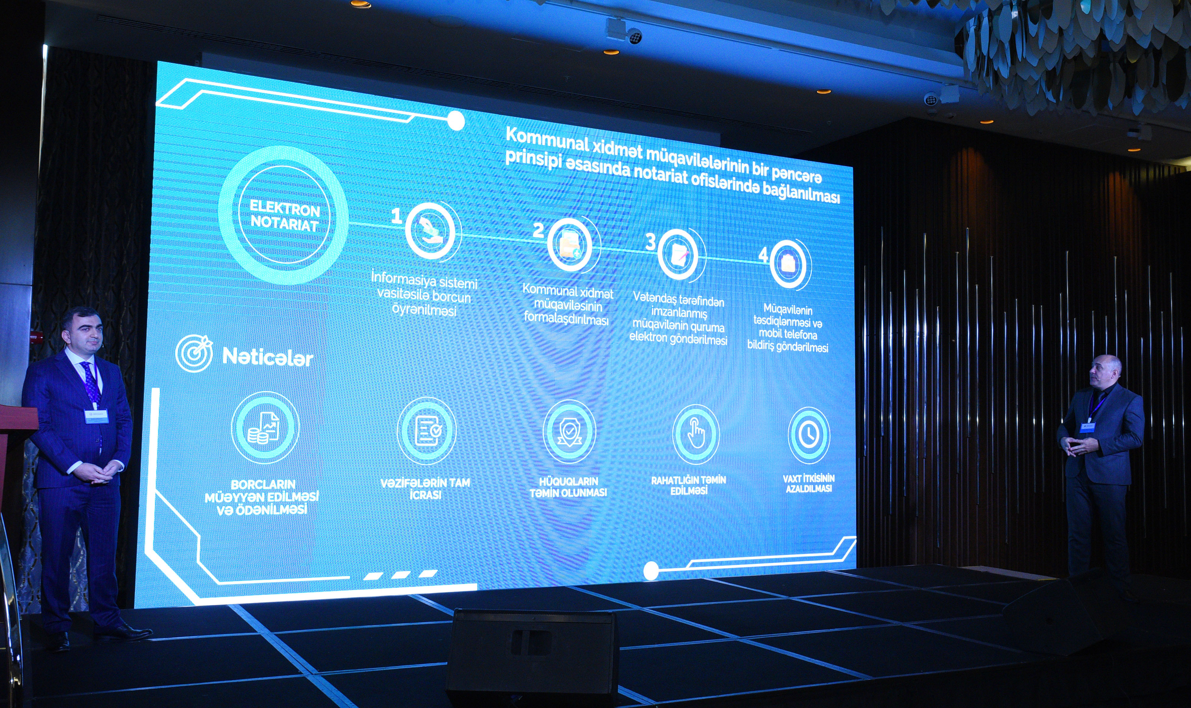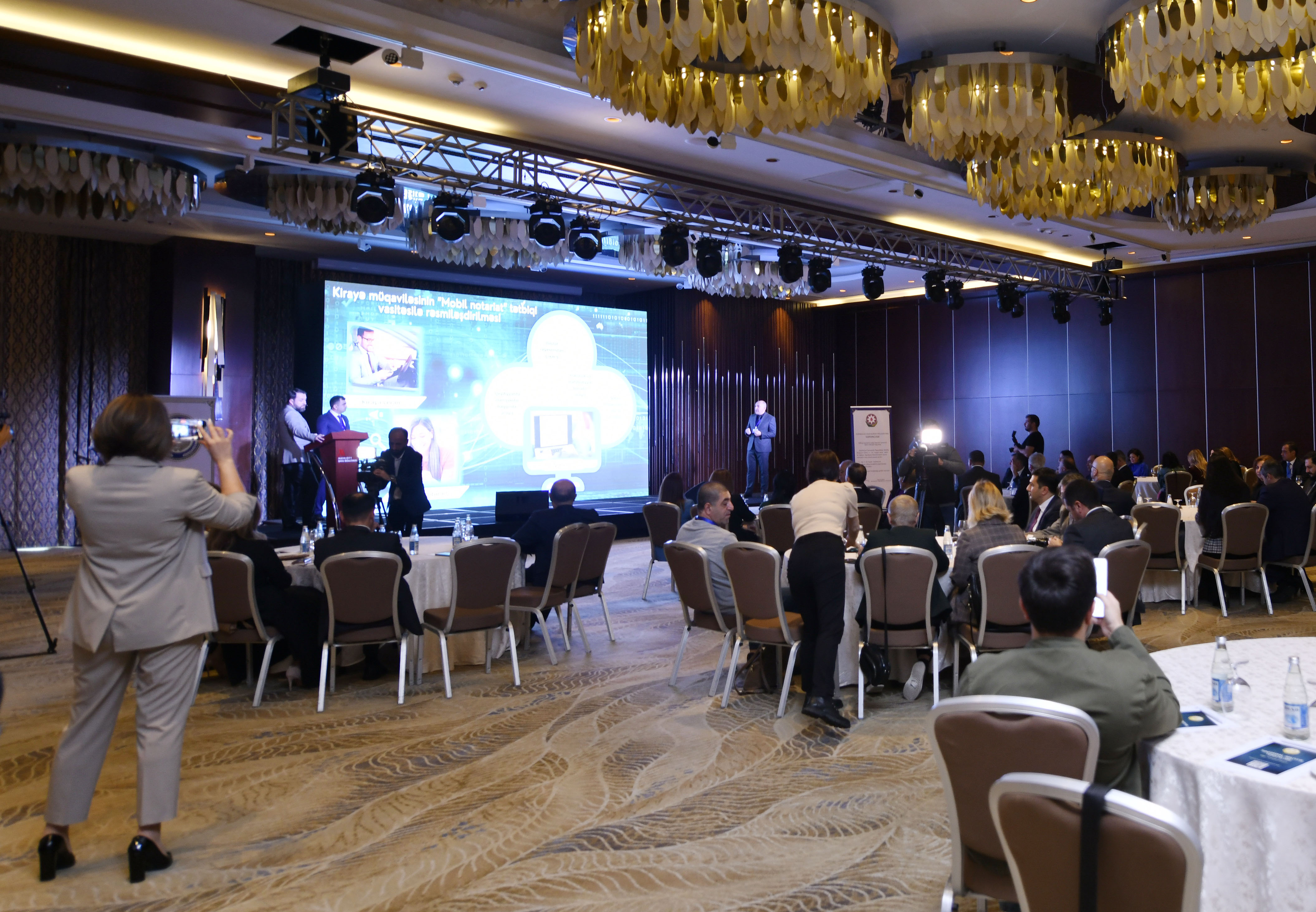 Təqdimatda nazirliyin İnformasiya- kommunukasiya texnologiyaları idarəsinin şöbə rəisi Abbas Teymurzadə və Qeydiyyat və notariat baş idarəsinin məsləhətçisi Zaur Həsənov innovativ notariat həlləri ilə bağlı çıxış edərək bu yaxınlarda tətbiq edilən yeniliklərin daşınmaz əmlakla bağlı etimadnamələrin “Mobil notariat” vasitəsilə rəsmiləşdirilməsi ilə bağlı olduğunu bildiriblər.