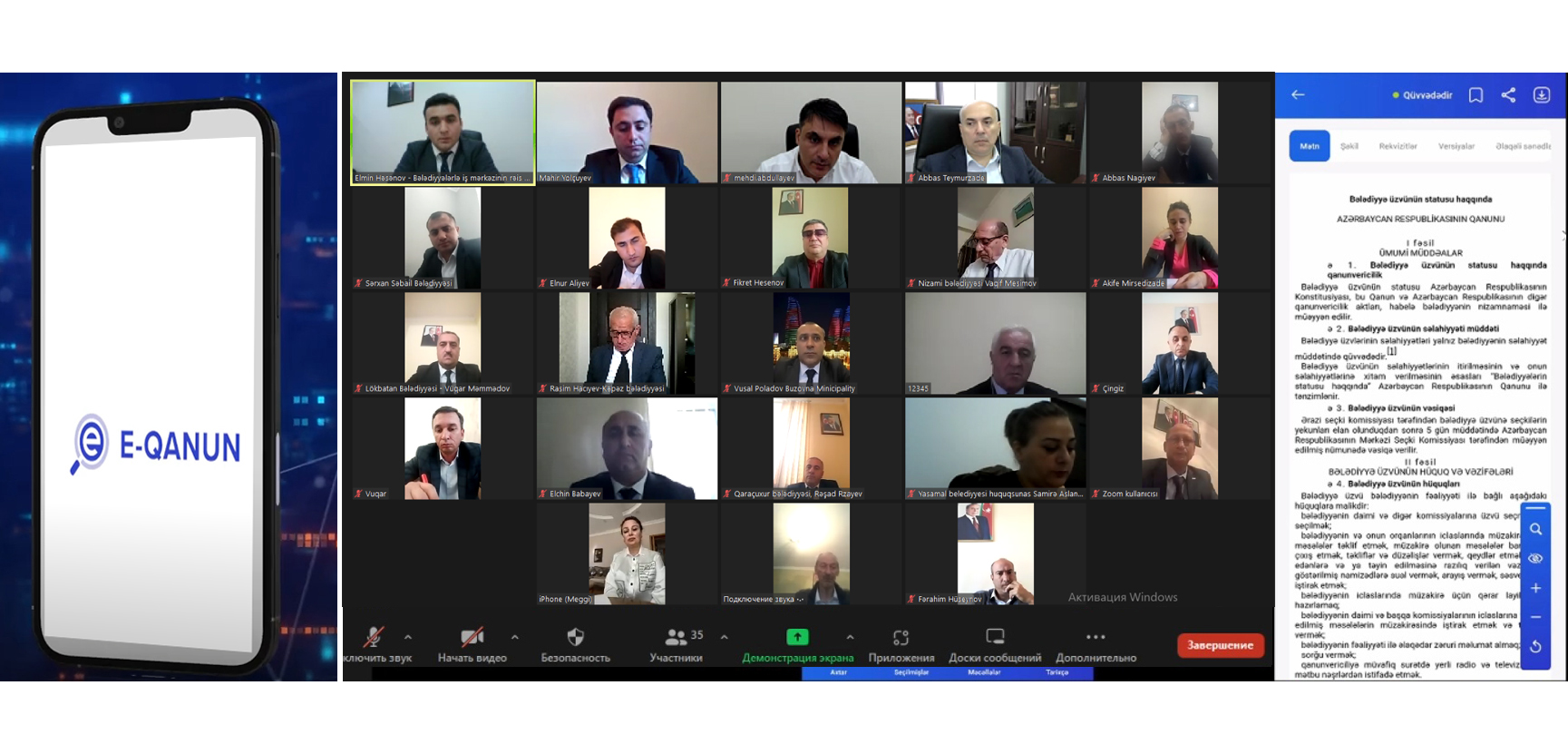 Nazirlik tərəfindən həmin innovativ xidmətin əhəmiyyətinin geniş ictimaiyyətə çatdırılması məqsədilə təqdimatlar davam etdirilir. Bununla bağlı Bələdiyyələrlə iş mərkəzində bütün bələdiyyə nümayəndələrinin iştirakı videoformatda tədbir keçirilib, “mobil E-qanun” tətbiqinin mahiyyəti aşılanıb, funksional imkanları nümayiş etdirilib.