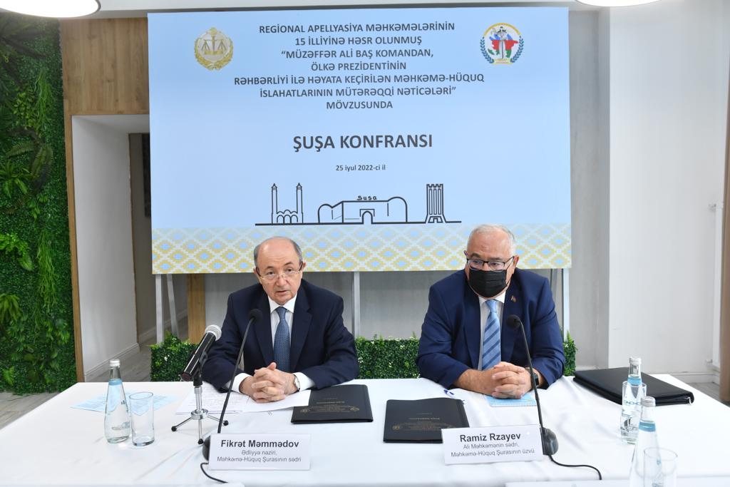 Ölkə Prezidenti, Müzəffər Ali Baş Komandan İlham Əliyevin yenilməz sərkərdəliyi ilə Vətən müharibəsində Böyük Qələbə qazanan ölkəmiz özünün ən qüdrətli dövrünü yaşayır, azad edilmiş ərazilərimiz nəhəng bərpa-quruculuq işləri aparılmaqla yenidən dirçəlir. 2022-ci il “Şuşa İli” elan olunaraq 270 illiyini qeyd etdiyimiz Qarabağın tacı, mədəniyyət paytaxtımızda “Xarıbülbül” Beynəlxalq Festivalı, Vaqif Poeziya Günləri və digər mötəbər tədbirlər təşkil olunur.“Şuşa İli” çərçivəsində iyulun 25-də Ədliyyə Nazirliyinin təşkilatçılığı ilə regional apellyasiya məhkəmələrinin 15 illiyinə həsr olunmuş “Azərbaycan Respublikasında həyata keçirilən məhkəmə-hüquq islahatlarının mütərəqqi nəticələri” mövzusunda Şuşa konfransı keçirilib.Bu münasibətlə Şuşa şəhərinə səfər edən konfrans iştirakçıları - ədliyyə işçiləri, hakimlər və ictimaiyyət nümayəndələri yolboyu erməni vəhşiliklərinin canlı şahidi olub, büsbütün dağıdılmış torpaqlarımızda aparılan misilsiz quruculuq işlərindən fəxarət hissi duyublar.Tədbirdə ədliyyə naziri, Məhkəmə-Hüquq Şurasının sədri Fikrət Məmmədov, Ali Məhkəmənin sədri Ramiz Rzayev, Məhkəmə-Hüquq Şurasının üzvləri, Ədliyyə Nazirliyinin, Baş Prokurorluğun, Vəkillər Kollegiyasının rəhbər şəxsləri, apellyasiya instansiyası məhkəmələrinin sədrləri, Qarabağ və Şərqi Zəngəzur üzrə ədliyyə və məhkəmə orqanlarının rəhbərləri, vətəndaş cəmiyyəti təmsilçiləri iştirak ediblər.Əvvəlcə Vətən müharibəsində qəhrəmancasına həlak olmuş şəhidlərimizin əziz xatirəsi bir dəqiqəlik sükutla yad edilib.Çıxış edən ədliyyə naziri konfrans iştirakçılarını Şuşada salamlamaqdan məmnunluğunu ifadə edərək doğma torpaqlarımızın Müzəffər Ali Baş Komandanın rəhbərliyi ilə, qəhrəman zabit və əsgərlərimizin ölçüyəgəlməz igidliyi sayəsində işğaldan azad edildiyini, göstərdikləri rəşadətə görə minlərlə hərbçilərimizin orden və medallarla təltif olunduğunu qeyd edib, ədliyyə və məhkəmə işçilərinin də döyüşlərdə fəal iştirak edərək şücaət və fədakarlıq nümayiş etdirdiklərini, müharibəyə könüllü yollanan nazirliyin əməkdaşının şəhid olduğunu vurğulayıb.Bildirib ki, şəhid ailələrinin, qazilərin qayğıları ölkə Prezidenti İlham Əliyevin və Birinci vitse-prezident Mehriban Əliyevanın daim diqqət mərkəzindədir. Həmin şəxslərin problemlərinə həssas münasibət hər bir kəsin vətəndaşlıq borcudur.Dövlət başçısı və birinci xanım tərəfindən azad olunmuş bölgələrə müntəzəm səfərlər edilərək nəhəng quruculuq işlərinin aparıldığı, artıq sabiq məcburi köçkünlərin doğma torpaqlarımızda məskunlaşmağa başladığı qeyd edilərək Ağalı kəndinin sakinlərinin yeni inşa olunmuş “Ağıllı kəndə” köçməsi ilə Böyük Qayıdışın əsasının qoyulduğu diqqətə çatdırılıb.Ümummilli lider Heydər Əliyevin əsasını qoyduğu mütərəqqi məhkəmə-hüquq islahatlarına toxunularaq, 2000-ci ildən fəaliyyət göstərən yeni, üçpilləli məhkəmə sisteminin, o cümlədən apellyasiya instansiyasının ötən dövrdə ədalət mühakiməsinə əlçatanlığın genişləndirilməsi məqsədilə təkmilləşdirildiyi, 35 məhkəmənin, xüsusilə 5 regional apellyasiya məhkəməsinin yaradıldığı vurğulanıb.15 illiyi qeyd olunan həmin məhkəmələrin məhkəmə səhvlərinin aradan qaldırılmasında və müvafiq məhkəmə təcrübəsinin formalaşmasında mühüm rolu qeyd olunub.“Məhkəmə-hüquq sistemində islahatların dərinləşdirilməsi haqqında” dövlət başçısının 03.04.2019-cu il tarixli proqram xarakterli Fərmanı xüsusi qeyd edilərək onun icrası çərçivəsində görülən kompleks qanunvericilik, institusional və praktiki tədbirlər barədə məlumat vertlib, məhkəmə islahatlarımızın beynəlxalq maraq doğuraraq təqdir olunduğu vurğulanıb.Ali Məhkəmənin sədri Ramiz Rzayev məhkəmə fəaliyyətinin müasirləşdirilməsi istiqamətində görülən tədbirlərdən danışıb, 3 aprel tarixli Fərmana uyğun olaraq vahid məhkəmə təcrübəsinin formalaşdırılması məqsədilə qanunvericiliyin təkmilləşdirildiyi, kassasiya instansiyası məhkəməsində işlərə baxılmasının xüsusiyyətləri barədə məlumat verib.Tədbirdə həmçinin, Bakı Apellyasiya Məhkəməsinin sədri Mübariz Əkbərov, Qarabağ regional ədliyyə idarəsinin rəhbəri Sübhi Kazımov, “Konstitusiya” Araşdırmalar Fondunun prezidenti Əliməmməd Nuriyev və digərləri çıxış edib, məhkəmə fəaliyyətinin müasirləşdirilməsi, vətəndaş məmnunluğunun artırılması və əlçatanlığın yaxşılaşdırılması, o cümlədən ölkə Prezidentinin yenicə təsdiq etdiyi “Azərbaycan Respublikasının 2022–2026-cı illərdə sosial-iqtisadi inkişaf Strategiyası”nın icrası üzrə qarşıda duran vəzifələr müzakirə olunub.Yekunda konfrans iştirakçılarının Azərbaycan Respublikasının Prezidenti cənab İlham Əliyevə müraciəti qəbul edilib, azad edilmiş torpaqlarda olmağın sevincini bəxş etdiyinə görə dövlətimizin başçısına dərin ehtiram ifadə olunub.Səfər çərçivəsində tədbir iştirakçıları həmçinin Şuşa şəhərində aparılan geniş miqyaslı quruculuq işləri, tarixi və mədəni abidələrimizlə tanış olub, maraqlı və yaddaqalan təəssürat yaşayıblar.