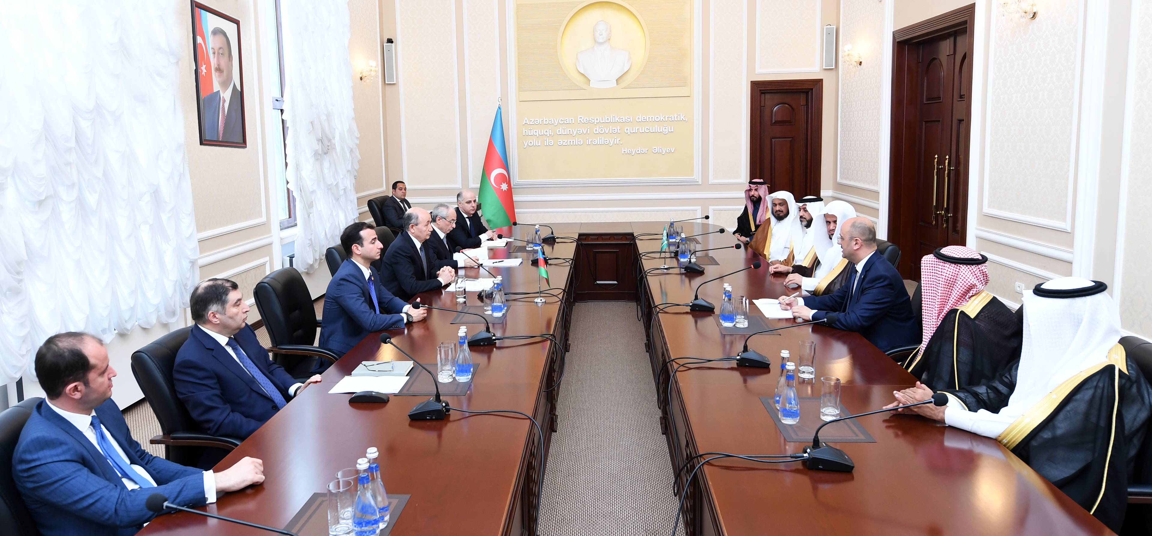 Mayın 12-də ədliyyə naziri Fikrət Məmmədov Azərbaycanda səfərdə olan Səudiyyə Ərəbistanı Krallığının Baş prokuroru Şeyx Səud bin Abdullah Əl Müacibin başçılıq etdiyi nümayəndə heyəti ilə görüşüb. Ölkələrimiz arasında tərəfdaşlıq münasibətlərinin inkişafını qeyd edən nazir bu əlaqələrin möhkəmlənməsində Azərbaycan Respublikasının Prezidenti İlham Əliyevin və İki Müqəddəs Ocağın Xadimi, Səudiyyə Ərəbistanının Kralı Salman bin Əbdüləziz Al Səudun mühüm rolunu vurğulayıb, diplomatik münasibətlərimizin qurulmasının 30 illiyinin qeyd olunduğunu bildirib, dövlətlərimizin eyni zamanda beynəlxalq təşkilatlar çərçivəsində də uğurla əməkdaşlıq etdiyini söyləyib. Nazir 2019-cu ildə bu ölkəyə məhsuldar səfərini və Səudiyyə Ərəbistanının Kralı tərəfindən qəbulunu, keçirdiyi rəsmi görüşləri böyük məmnunluqla xatırladıb, Ədliyyə nazirlikləri arasında imzalanmış əməkdaşlıq haqqında Anlaşma Memorandumunun qarşılıqlı fəaliyyətin inkişafına xidmət etdiyini vurğulayıb. Qeyd edib ki, həmkarı Dr. Valid bin Mohammad Al-Samaaninin ölkəmizə səfəri çərçivəsində Əməkdaşlıq proqramı imzalanıb, bu zaman Azərbaycan təcrübəsinə maraq göstərilib. Şeyx Səud bin Abdullah Əl Müacib iki ölkə rəhbərləri arasında olan münasibətlərin dövlətlərimiz arasında əlaqələrin inkişafına güclü təkan verdiyini vurğulayıb, səfər zamanı Prezident İlham Əliyev tərəfindən qəbul olunmasından şərəf duyduğunu bildirib. Qeyd edib ki, Azərbaycanın iqtisadi inkişafı, həmçinin azad edilmiş torpaqlarımızın bərpası ilə bağlı görülən işlər çox sevindiricidir. Azərbaycan Prezidenti öz ölkəsinin təhlükəsizliyi və firavanlığı naminə böyük işlər görür və qısa müddətdə uğurlara nail olunub. Görüşdə hər iki ölkədə ədliyyə və məhkəmə-hüquq sahəsində aparılan islahatlar barədə faydalı fikir mübadiləsi aparılıb, nümayəndə heyətlərinin səfərlərinin təcrübə mübadiləsi baxımından əhəmiyyəti qeyd edilib. Qonaq iki ölkə arasında əlaqələrin müxtəlif istiqamətlərdə, o cümlədən ədliyyə və prokurorluq sahəsində inkişaf etdirilməsində maraqlı olduğunu söyləyib. Eyni zamanda cinayətkarlıqla mübarizədə beynəlxalq əməkdaşlığa toxunularaq Azərbaycan və Səudiyyə Ərəbistanının Beynəlxalq Prokurorlar Assosiasiyasında fəal təmsilçiliyi qeyd olunub, habelə beynəlxalq antikorrupsiya mübarizəsində əməkdaşlıq imkanları müzakirə edilib. F.Məmmədov ölkəmizin həmtəsisçiliyi yaradılmış Beynəlxalq Antikorrupsiya Orqanları Assosiasiyasının (IAACA) fəaliyyəti barədə məlumat verib, vitse-prezidenti olduğu Assosiasiyanın işində Səudiyyə Ərəbistanını iştiraka təşviq edib. Baş prokuror ölkəsində korrupsiyaya qarşı mübarizənin prioritet olduğunu və bu sahədə beynəlxalq fəaliyyətə mühüm əhəmiyyət verdiyini bildirərək IAACA ilə əməkdaşlığa maraq göstərib. Tədbirdə Səudiyyə Ərəbistanının qədim paytaxtı, YUNESKO-nun ümumdünya mədəni irs siyahısına daxil olan Diriiyyə şəhəri haqqında azərbaycanlı müəllifin “Diriiyyə - açıq səma altında muzey” adlı kitabı qonağa təqdim edilib. Bildirilib ki, kitab ərəb dilinə Əlahəzrət Kralın xeyir-duası ilə tərcümə olunub. Səudiyyə Ərəbistanının Azərbaycandakı səfiri Haməd bin Abdullah bin Səud bin Xudeyr görüşdə iştirak edib. Nümayəndə heyəti nazirlikdə ədliyyə tarixinə və Vətən müharibəsində Böyük Qələbəyə həsr olunmuş muzeylərlə tanış olublar.